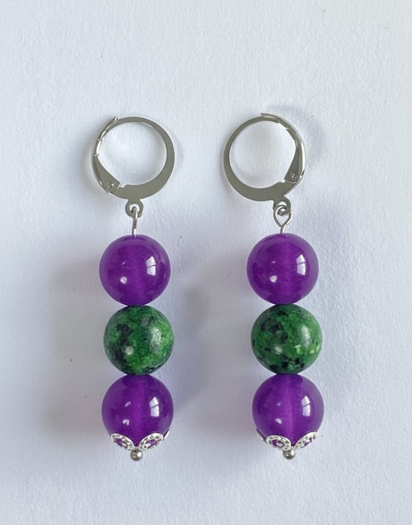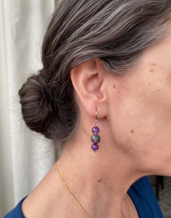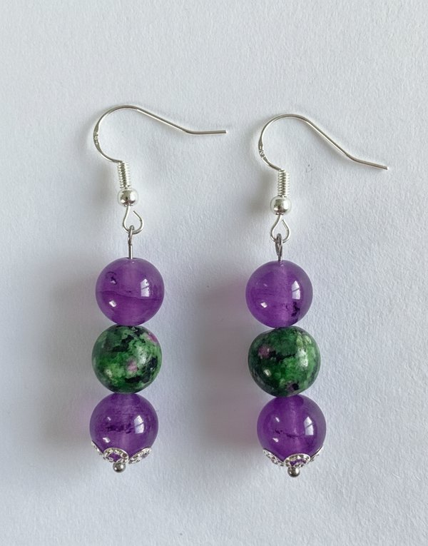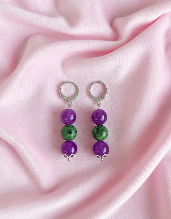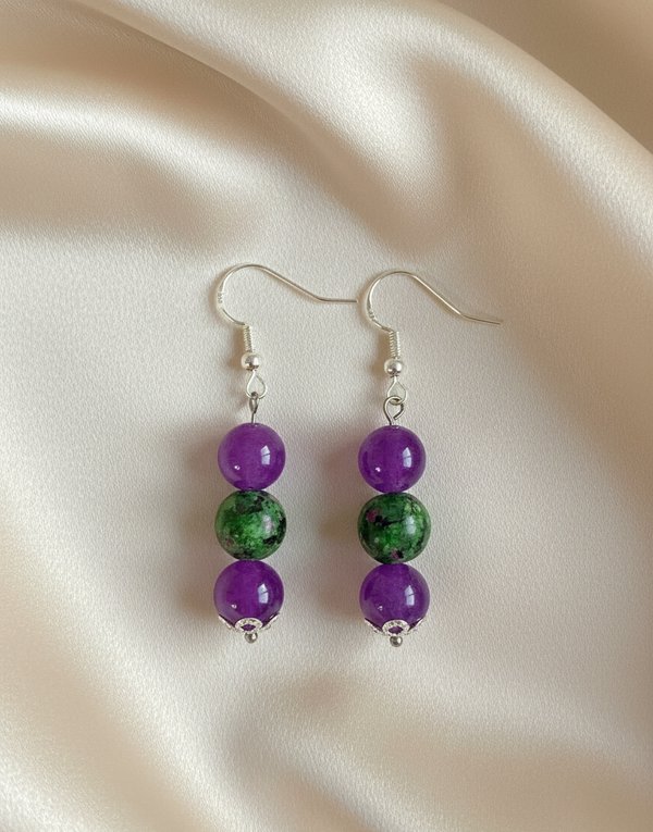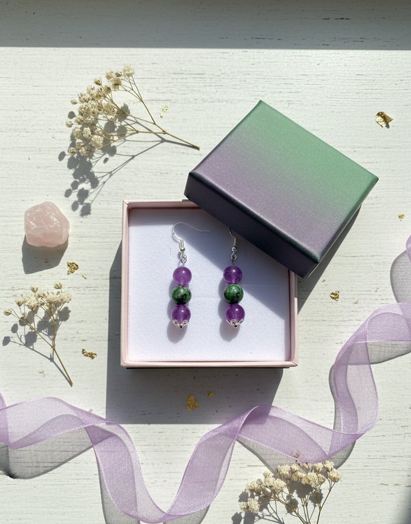 amethyst ruby zoisite earrings; handmade gemstone jewellery; purple and green crystal earrings; heart chakra jewellery; crown chakra earrings; third eye chakra jewellery; spiritual balance earrings; natural amethyst ruby zoisite beads; artisan crystal earrings; healing gemstone jewellery; meditation earrings; protection and love stones; gift for her; handmade gift for mom; boho gemstone earrings; birthday gift for friend