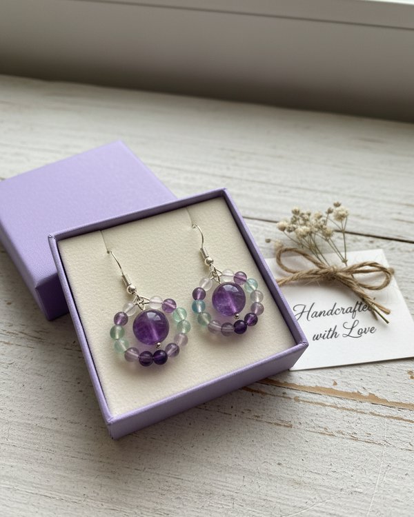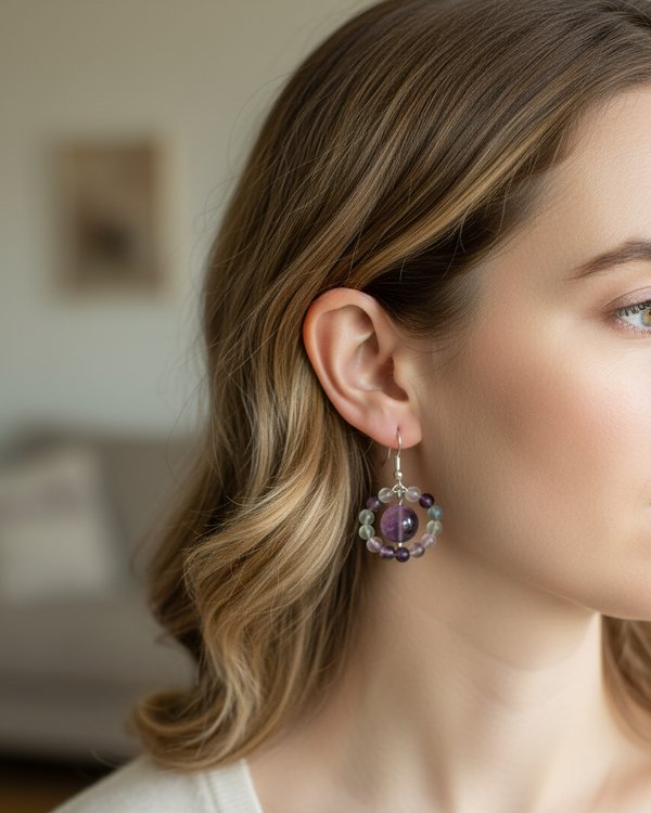 Add elegance and grounding energy to your style with these handmade Fluorite earrings, featuring a large 10mm polished Fluorite bead framed by a rainbow of smaller Fluorite stones. Set on 925 Sterling Silver hooks, they’re lightweight, hypoallergenic, and comfortable for daily wear.