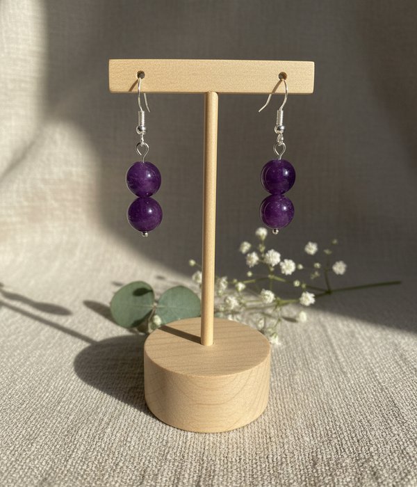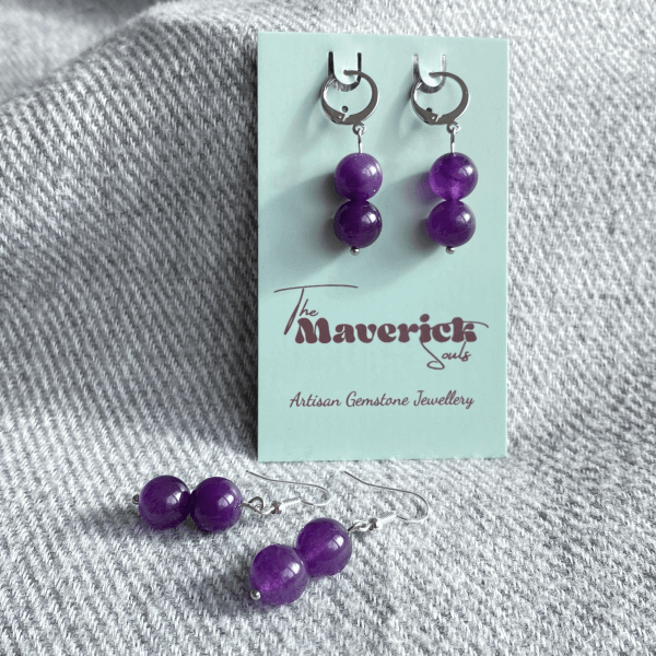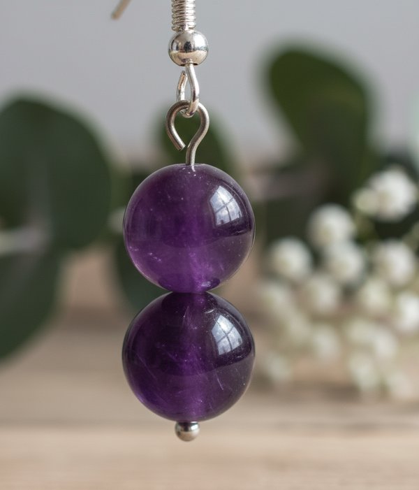 amethyst earrings; handmade amethyst jewellery; purple gemstone earrings; crown chakra jewellery; third eye chakra earrings; calming crystal earrings; natural amethyst beads; spiritual jewellery; artisan gemstone earrings; boho amethyst earrings; protective stone jewellery; 10mm amethyst beads; healing stone earrings; gift for her; handmade gift for mom; birthday gift for friend; meditation jewellery
