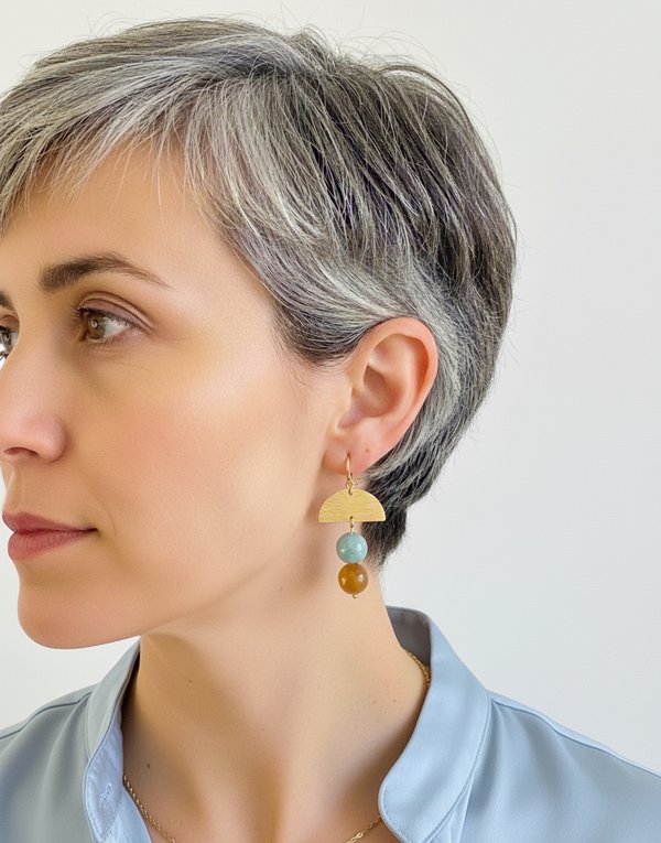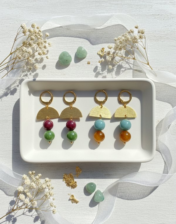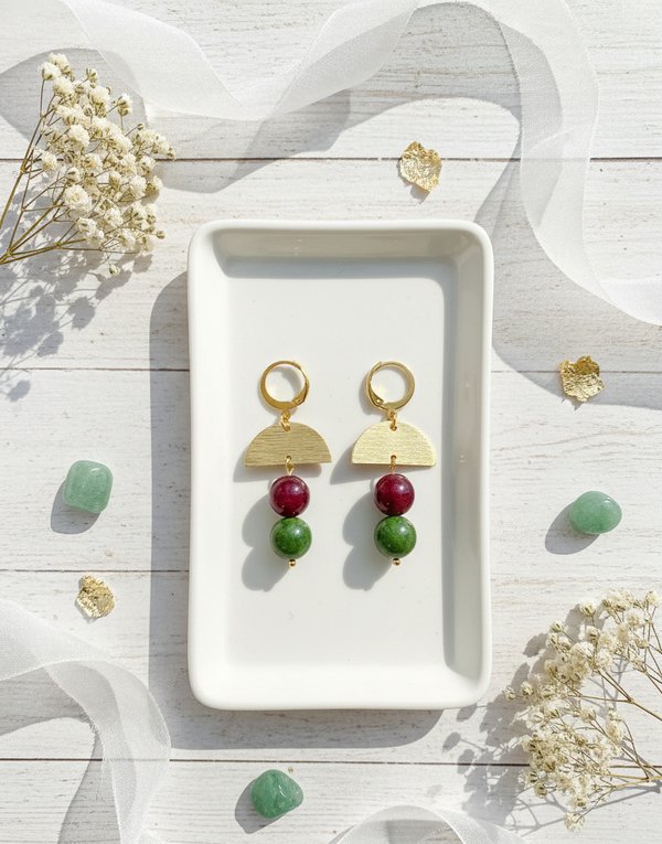 Tourmaline is a crystalline boron silicate mineral found in a stunning variety of colors, often discovered in regions such as Brazil, Madagascar, and Afghanistan. While these earrings feature dyed tourmaline gemstones to highlight their vivid tones, natural tourmaline is admired for its unique crystal structure, strong vitreous luster, and ability to form in multiple color zones within a single stone. Long cherished as a stone of protection and creativity, tourmaline beautifully bridges natural elegance with spiritual symbolism.
