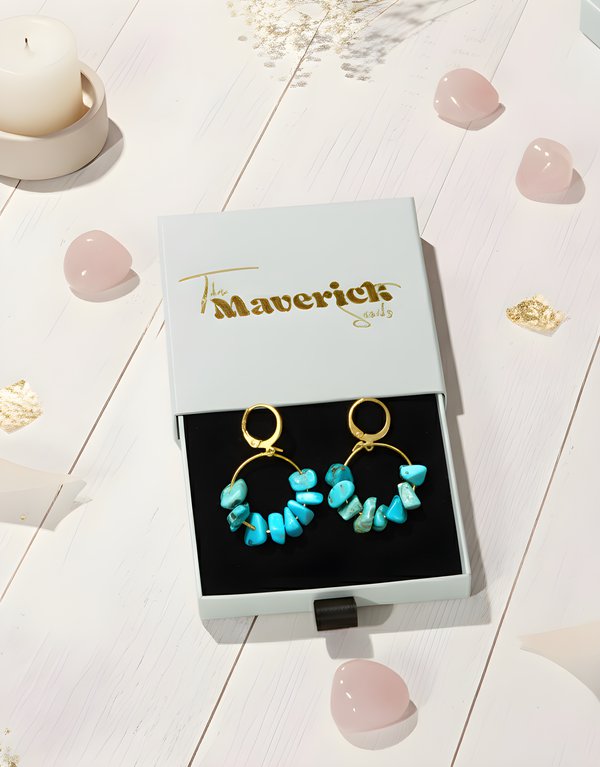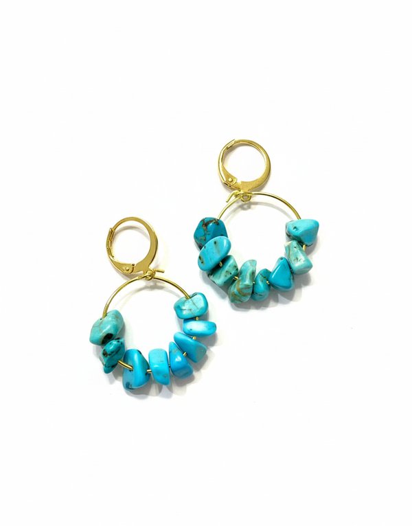 turquoise howlite earrings; dyed howlite hoop earrings; handmade turquoise earrings; gold hoop gemstone earrings; boho crystal earrings; calming stone jewellery; crown chakra earrings; communication crystal earrings; turquoise blue earrings; natural gemstone hoops; howlite chip earrings; artisan gemstone jewellery; spiritual hoop earrings; protection crystal earrings; stress relief jewellery; gold plated stainless steel earrings; healing stone hoops; gift for her; handmade gift for mom; birthday gift for friend; bohemian turquoise earrings; meditation jewellery; mindful gift for women; turquoise coloured earrings; minimalist gemstone hoops